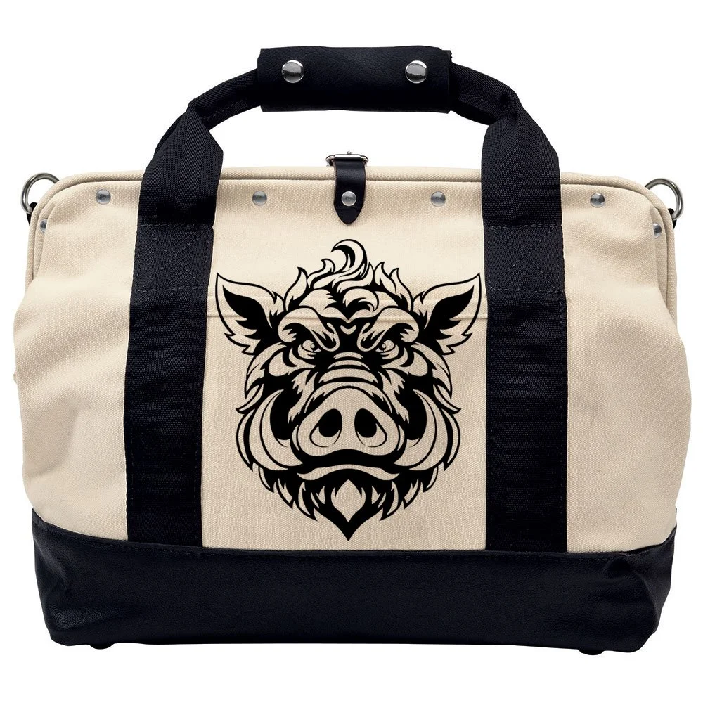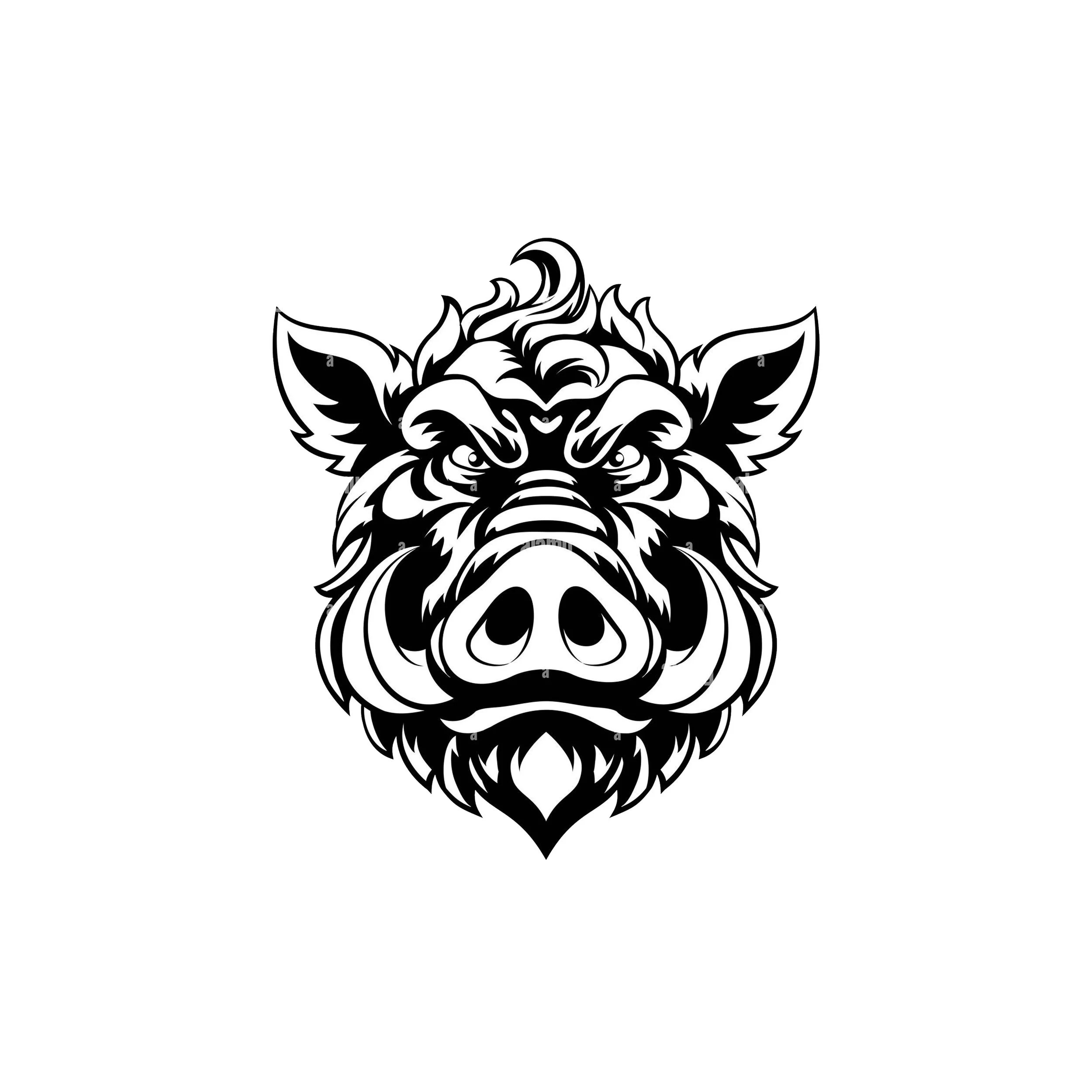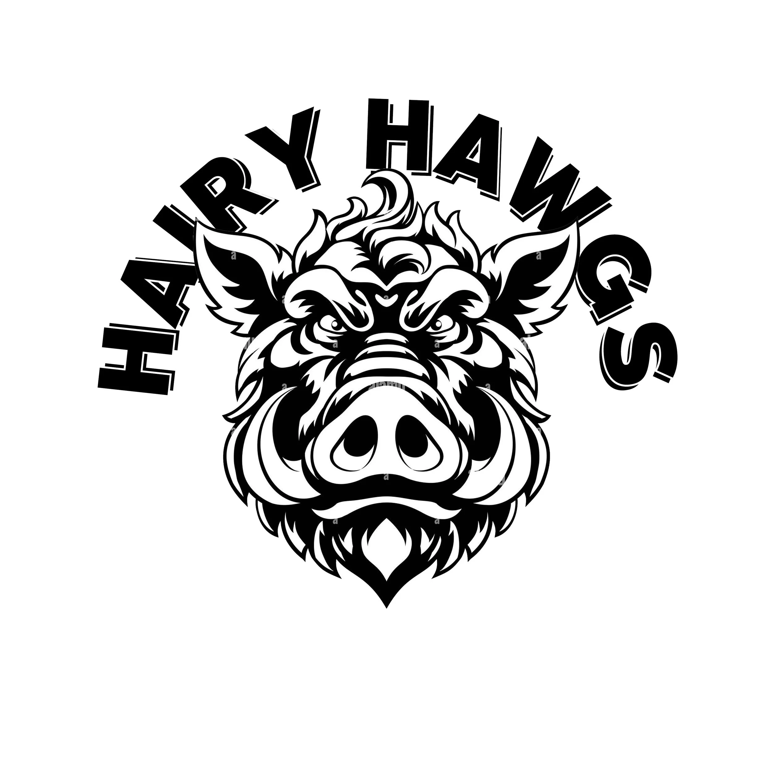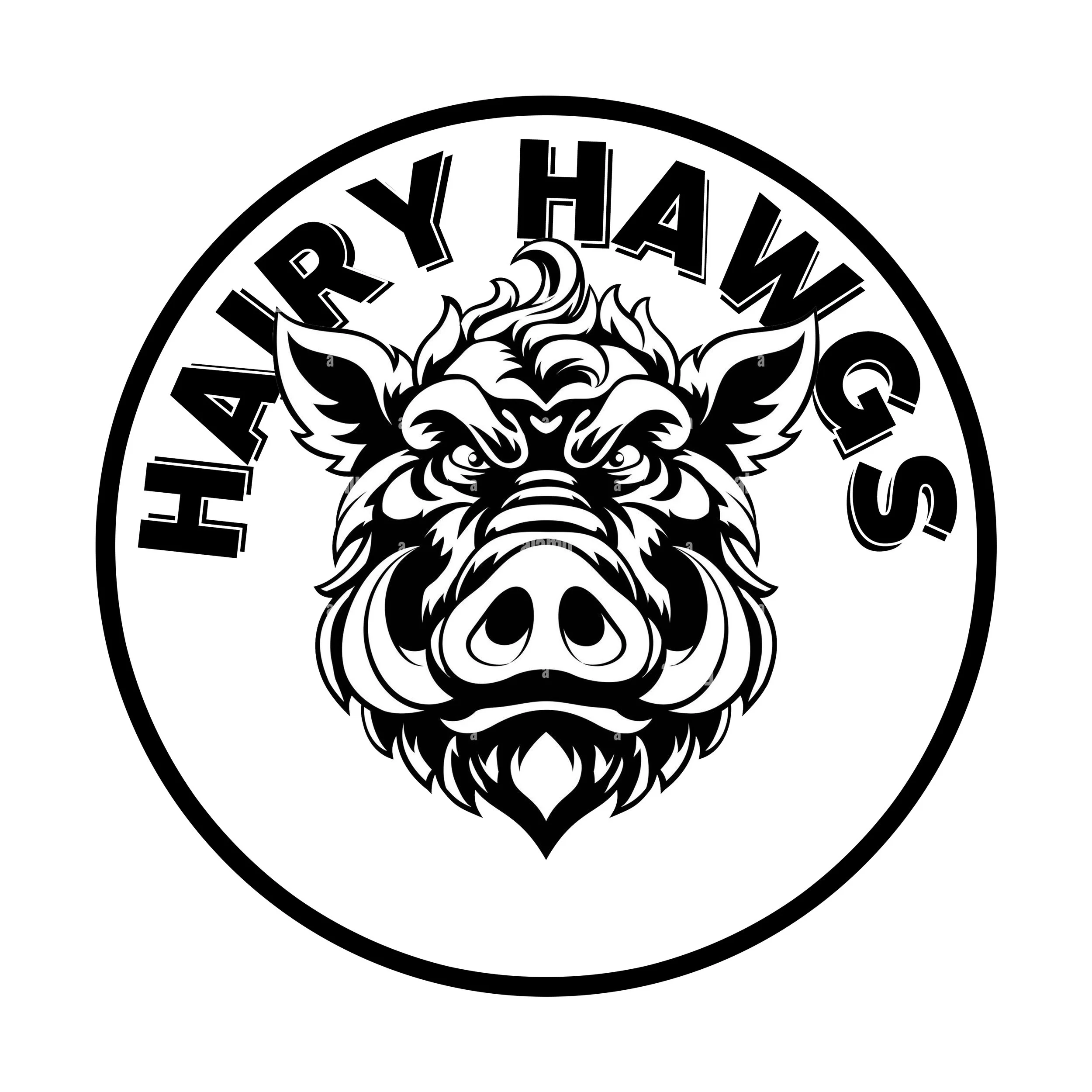 Logo is a circle with a wild boar cartoon face, tusks showing, inside of “Hairy Hoggs Hardware” wording just inside the circle.